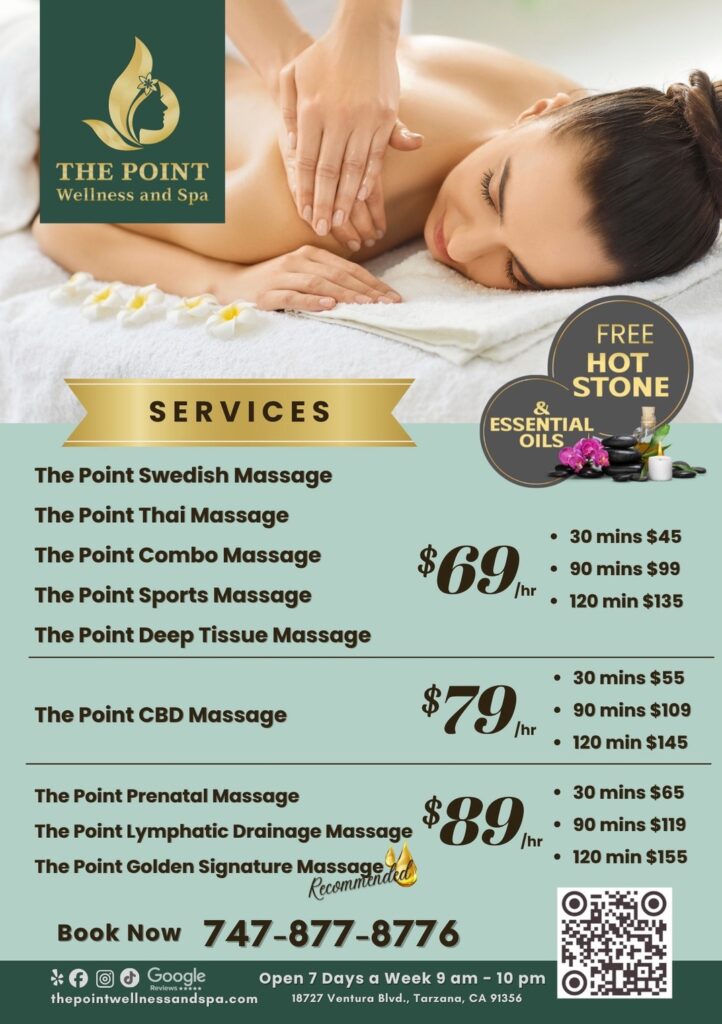 The Point Combo Massage is a blend of Thai massage and Swedish/Deep Tissue techniques. It includes stretching, acupressure, and relaxing oil massage to help relieve muscle tension and improve flexibility.